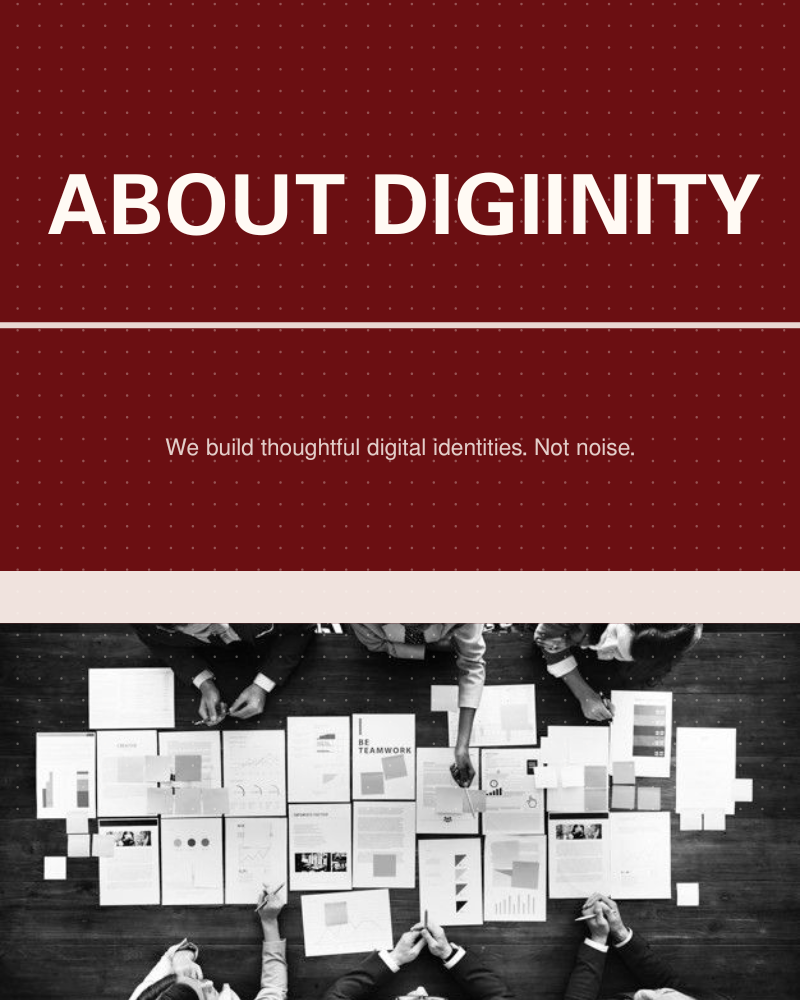 We don’t chase trends. We build brands that last. At Digiinity, we are a digital studio focused on creating meaningful brand experiences. We believe strong brands are not built overnight — they are shaped through clarity, consistency, and purpose. Our approach blends strategy, design, and digital marketing to help businesses establish a powerful online presence. From brand identity and visual storytelling to performance-driven marketing, every detail is crafted to reflect authenticity and long-term value. We work closely with our clients, understanding their vision, audience, and goals, to create solutions that feel intentional — not forced. The result is work that feels timeless, impactful, and aligned with the brand’s core. Because real growth comes from substance, not shortcuts.